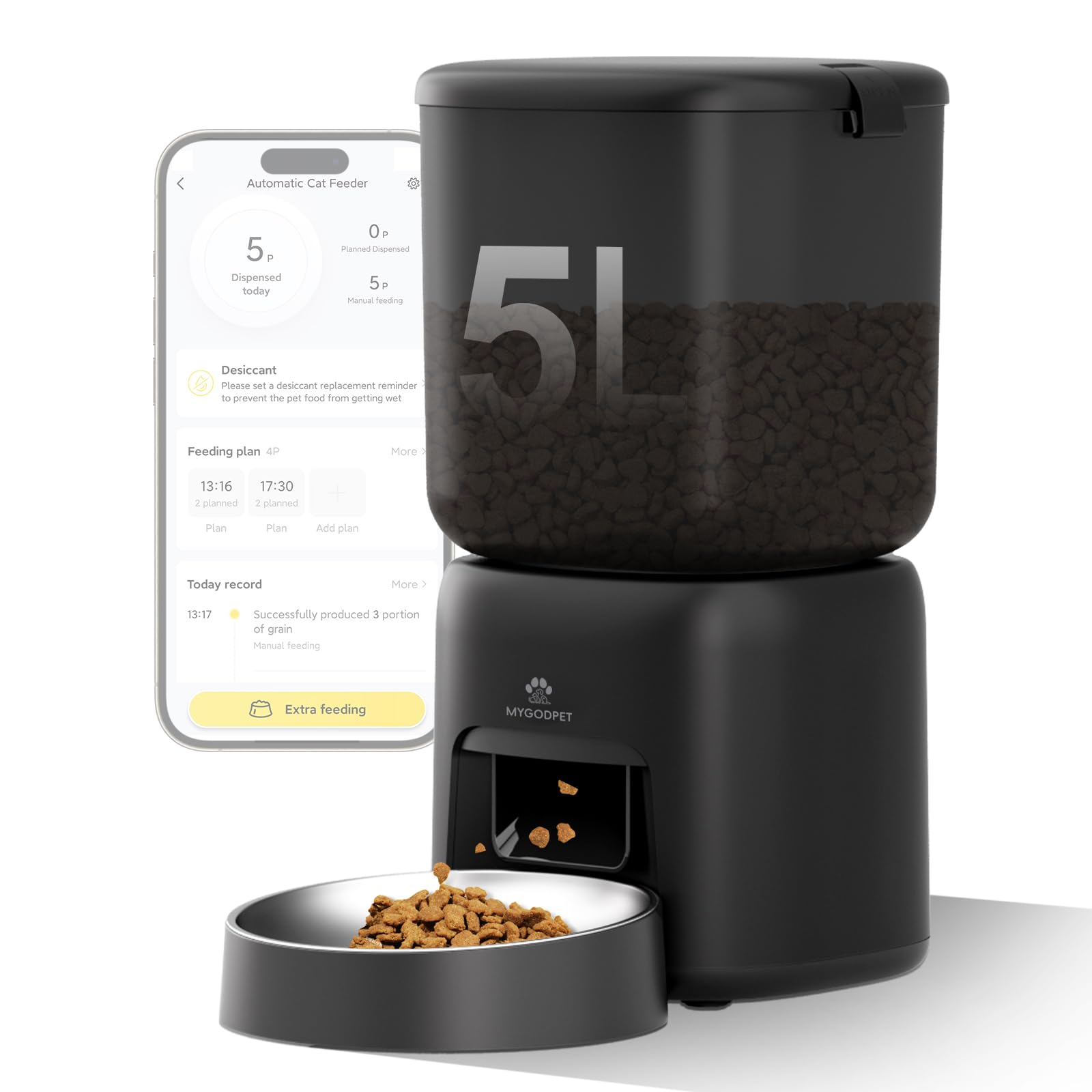 Automatic Cat Feeder, 5G WiFi Auto Cat Food Dispenser with Desiccant Bag, 5L Timed Pet Feeder with Free APP Service, Adjustable Portions Down to 1/12 Cup, Up to 10 Meals Per Day, Dual Power Supply