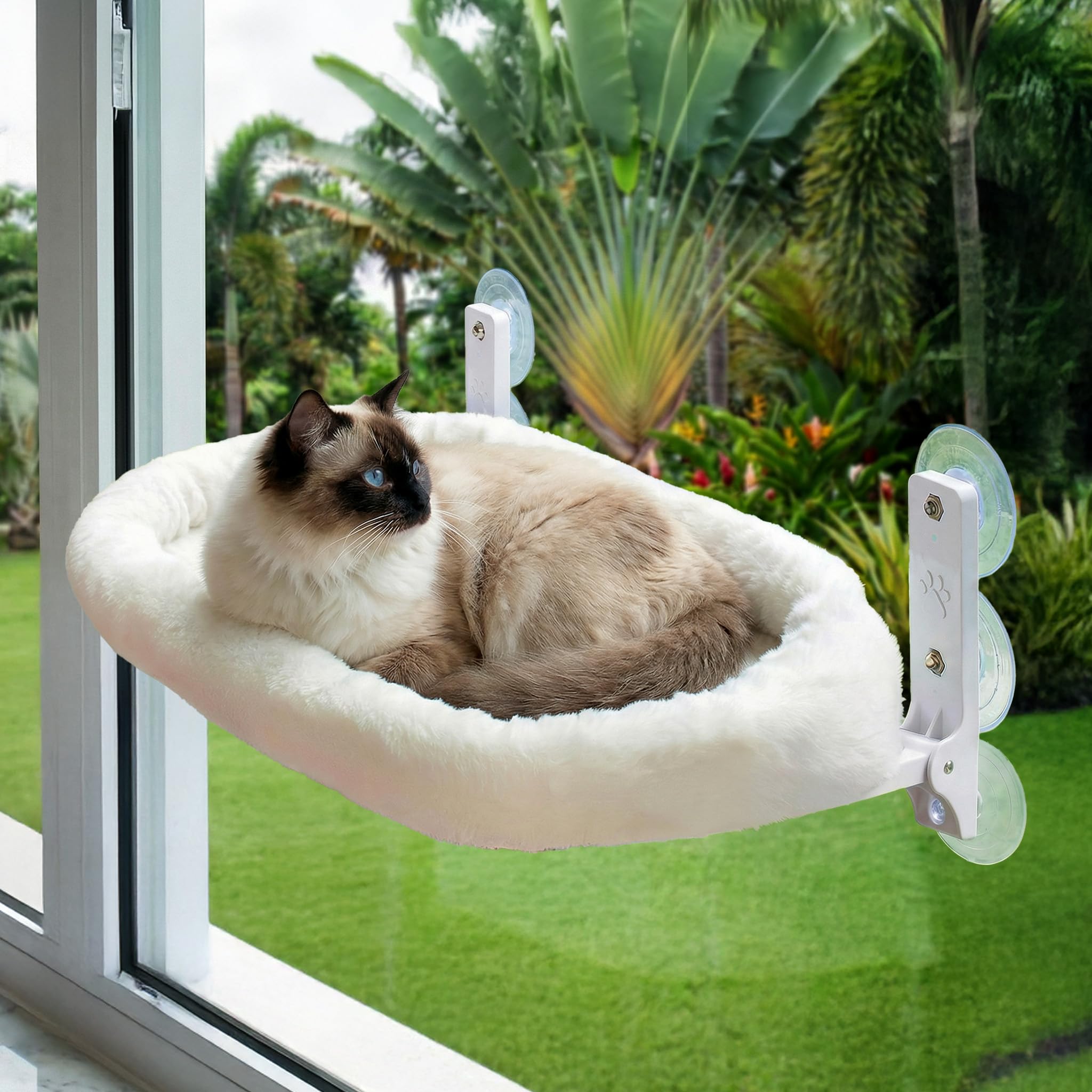 Golden Sheaves Cat Window Perch – Strong 6 Suction Cup Foldable Cat Hammock Bed for Large Cats and Kittens that Holds up to 50 lbs with Washable Reversible Cover, Sturdy Metal Frame for Window (White)