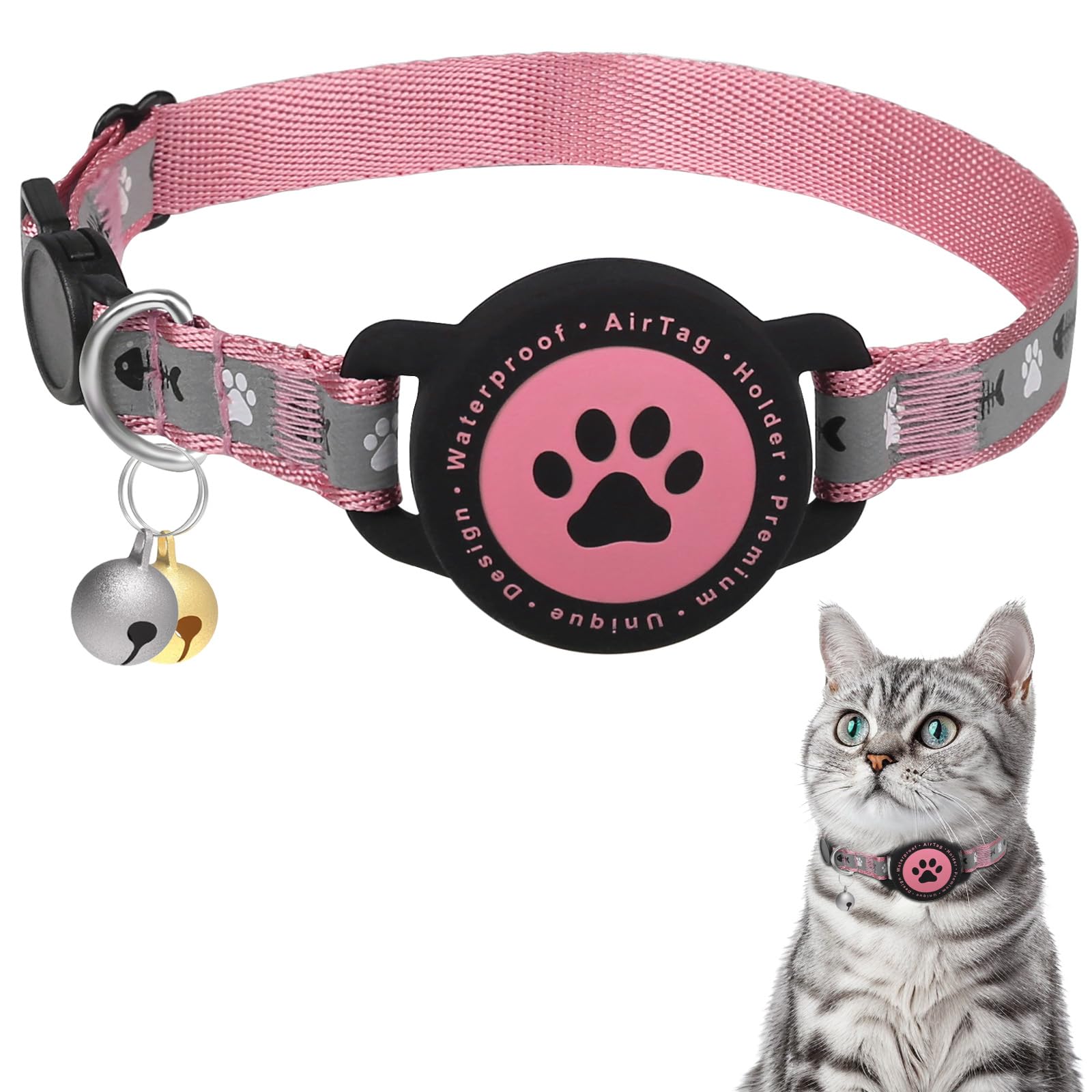 Waterproof Airtag Cat Collar, Reflective With Bell, Breakaway Holder, Lightweight for Apple Air Tag, GPS Collars for Girl Boy Cats, Kitten (Pink)